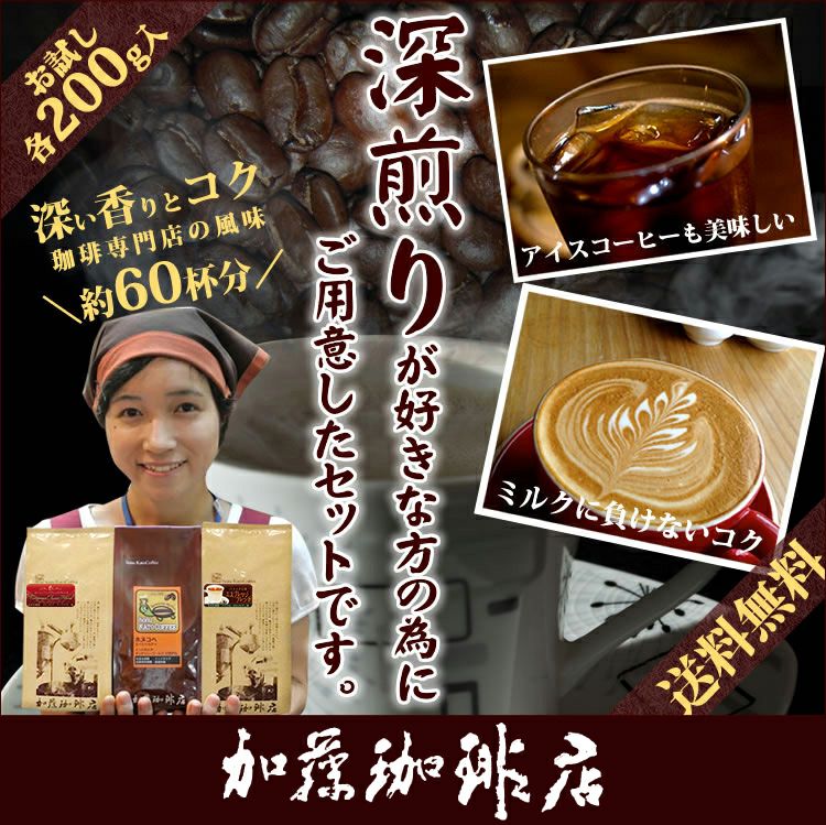 深煎り好きな方の為にご用意した珈琲豆セットにお試しサイズが登場!珈琲専門店の風味!カフェラテ・カフェオーレ・カプチーノ・エスプレッソ・アイスコーヒーにも最適♪深煎り飲み比べ用のお試しセットとしてもオススメです。