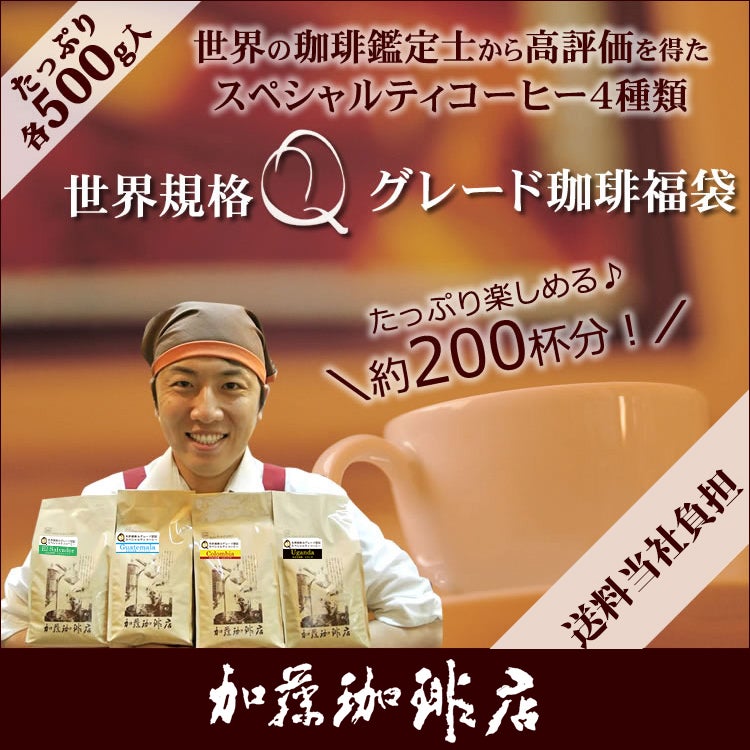 送料無料 コーヒー 珈琲 加藤珈琲 スペシャルティ 世界規格Qグレード珈琲福袋(お菓子・Qエル・Qウガ・Qコロ・Qグァテ 各500g)珈琲豆 加藤珈琲/珈琲豆 コーヒー豆 コーヒー 2kg 福袋