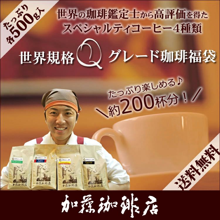 送料無料 コーヒー 珈琲 加藤珈琲 スペシャルティ 世界規格Qグレード珈琲福袋(お菓子・Qエル・Qウガ・Qコロ・Qラオ 各500g)珈琲豆 加藤珈琲/珈琲豆 コーヒー豆 コーヒー 2kg 福袋