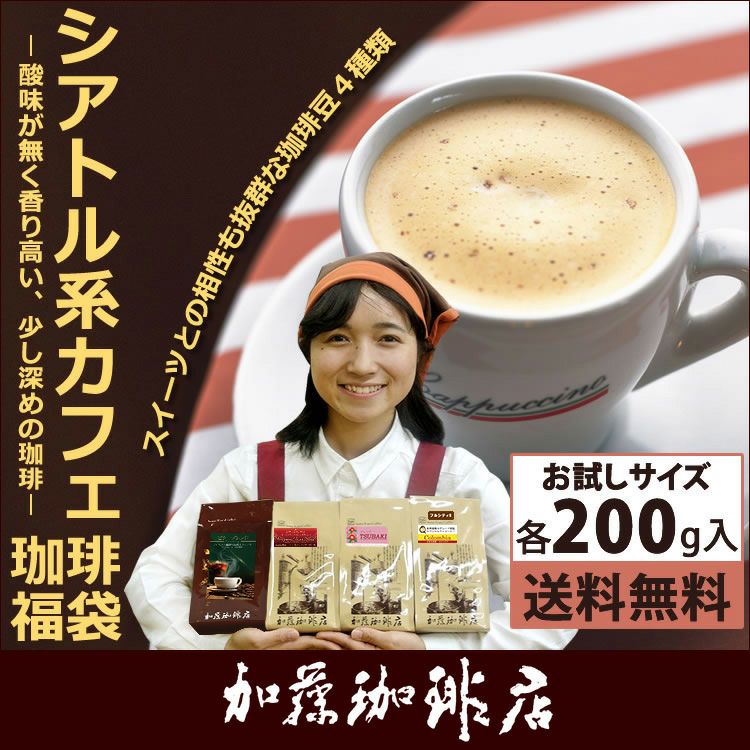 送料無料 コーヒー 珈琲 加藤珈琲 スペシャルティ (200gVer)新・シアトル系カフェ珈琲福袋(フルQコロ・ビター・ヨーロ・TSUBAKI)/珈琲豆