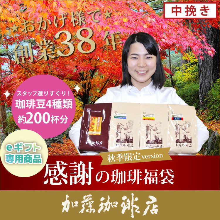 【スタッフ一同大感激!】おかげ様でコーヒー一筋の私ども加藤珈琲店は創業38年を迎えることができました。感謝の気持ちを込めたコーヒーセットを精一杯お値打ちにご提供させて頂きます。選りすぐりの珈琲豆たっぷり約200杯分入りで大奉仕!!