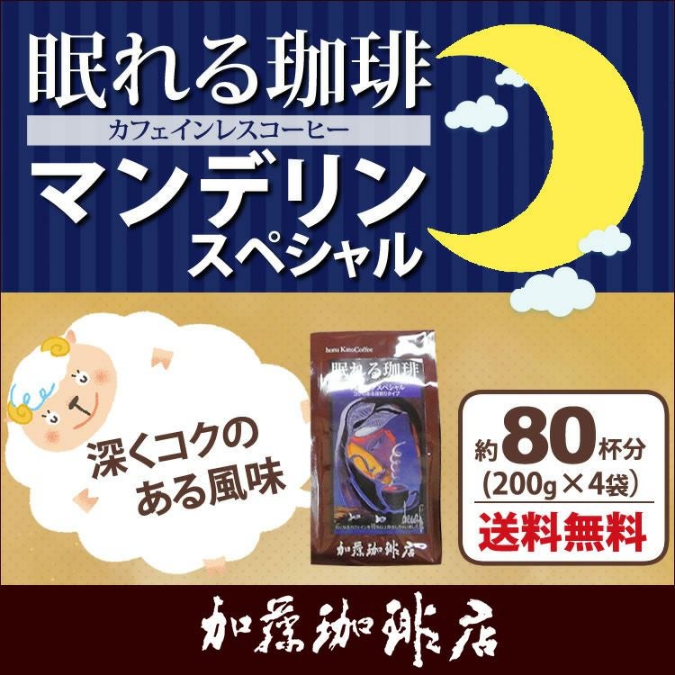 送料無料 コーヒー 珈琲 加藤珈琲 スペシャルティ [200g4袋]眠れる珈琲マンデリンスペシャル (Dマンデ×4/各200g)(デカフェ・カフェインレスコーヒー)/珈琲豆