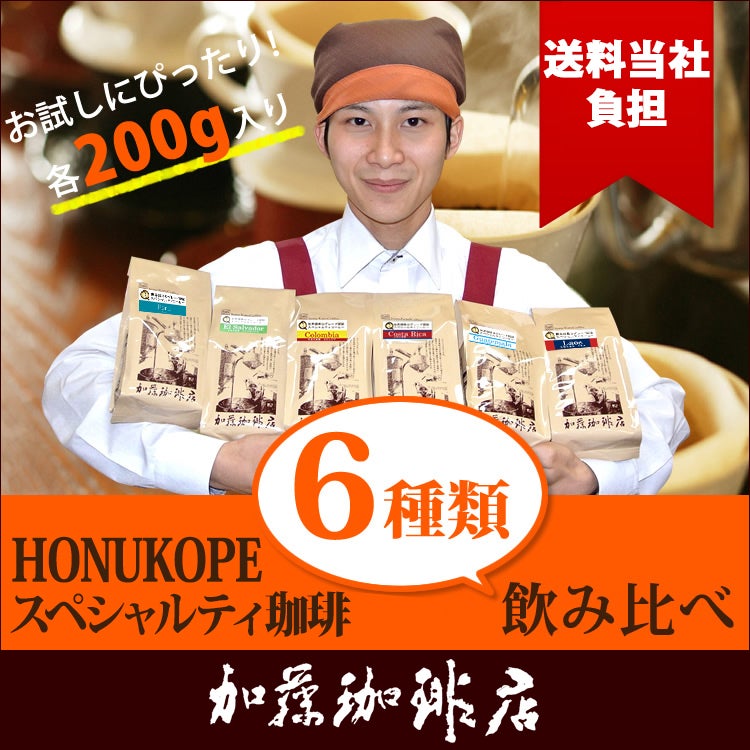 送料無料 コーヒー 珈琲 加藤珈琲 スペシャルティ HONUKOPEスペシャルティ珈琲・6種類飲み比べ福袋(Qペル・Qエル・Qコロ・Qコス・Qグァテ・Qラオ/各200g)/珈琲豆